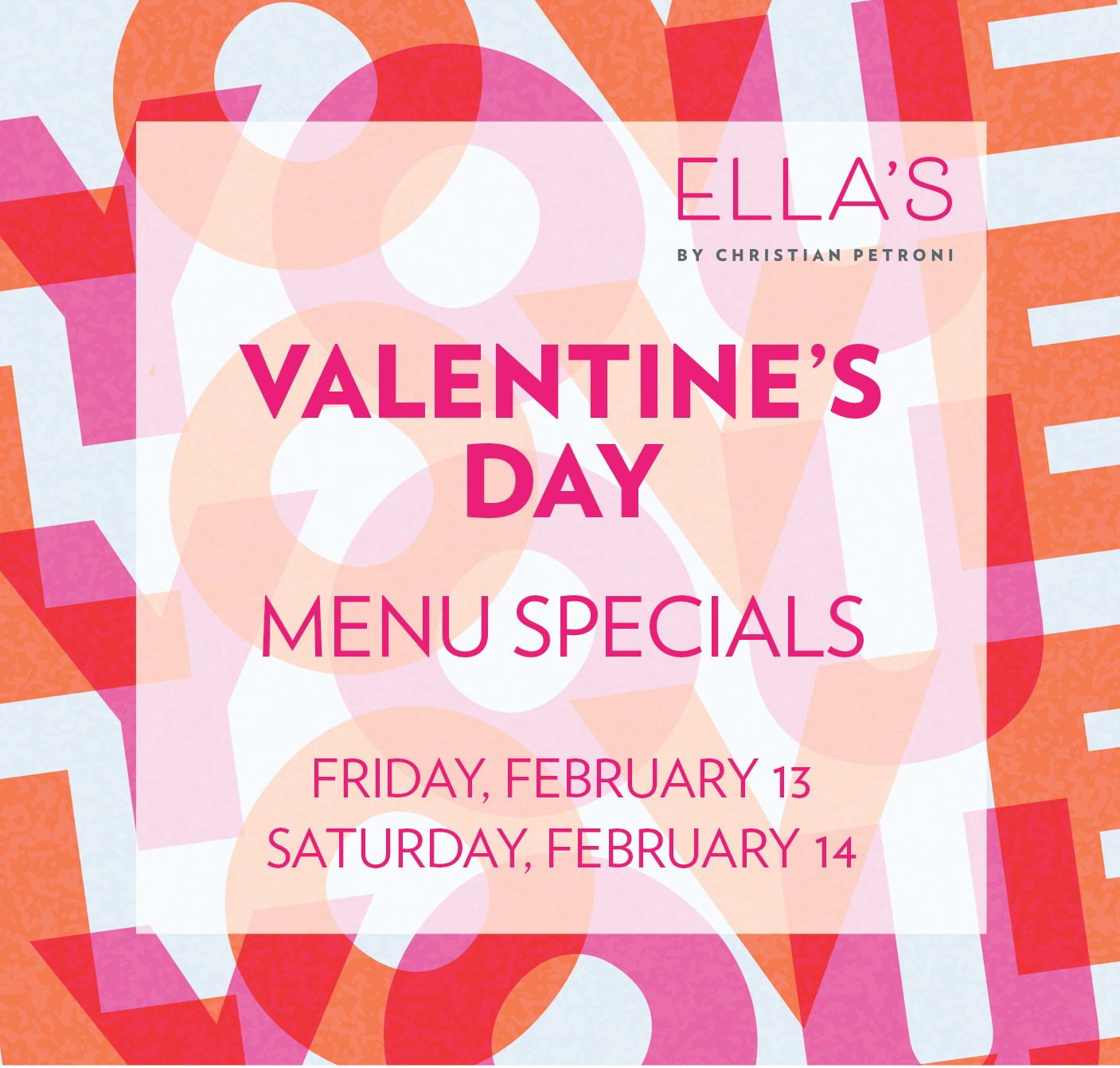 Celebrate Valentine’s Day at Ella’s with our Valentine’s Day menu specials, offered alongside our à la carte menu.